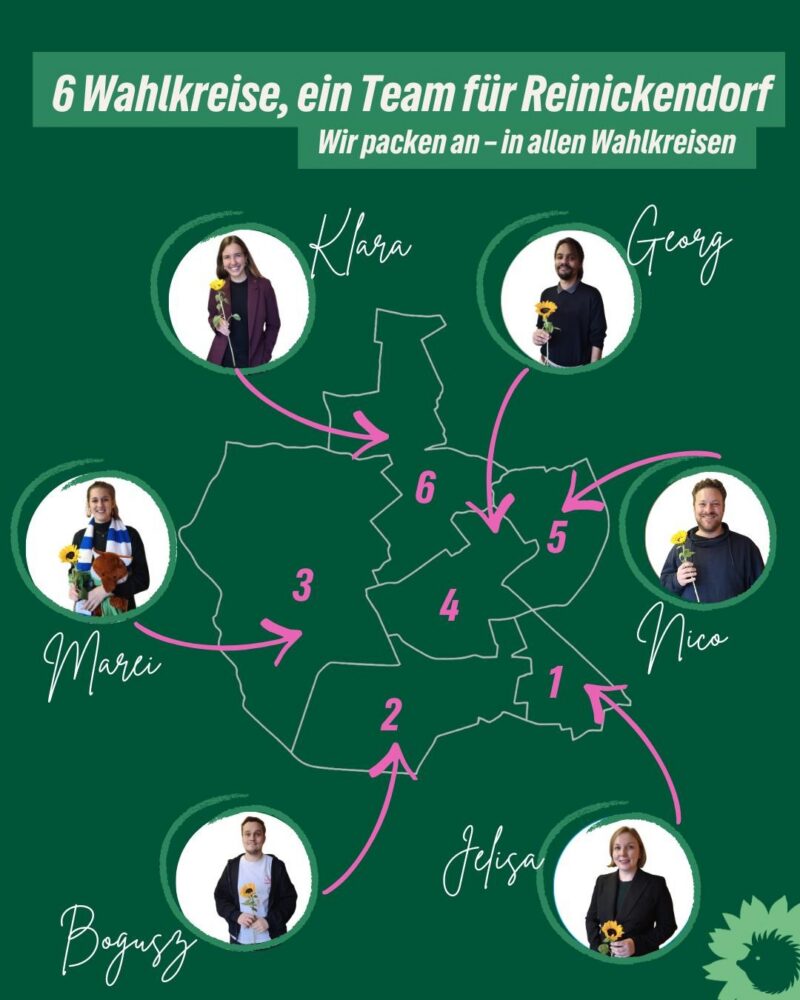 Der Kreisverband Reinickendorf hat seine Kandidat*innen für die Direktwahlkreise zur Abgeordnetenhauswahl am 20. September 2026 nominiert. Um den Herausforderungen des Klimawandels zu begegnen und die Menschen vor Ort bei der gerechten Gestaltung einzubinden, braucht es entsprechend kompetente Menschen. Der Kreisverband Reinickendorf ist daher besonders stolz, zur Wahl mit sechs Kandidat*innen anzutreten, die Reinickendorf ihr zu Hause nennen, in ihren Wahlkreisen auch über die Politik hinaus bekannt sind sowie die Vielfalt unseres Bezirks widerspiegeln.